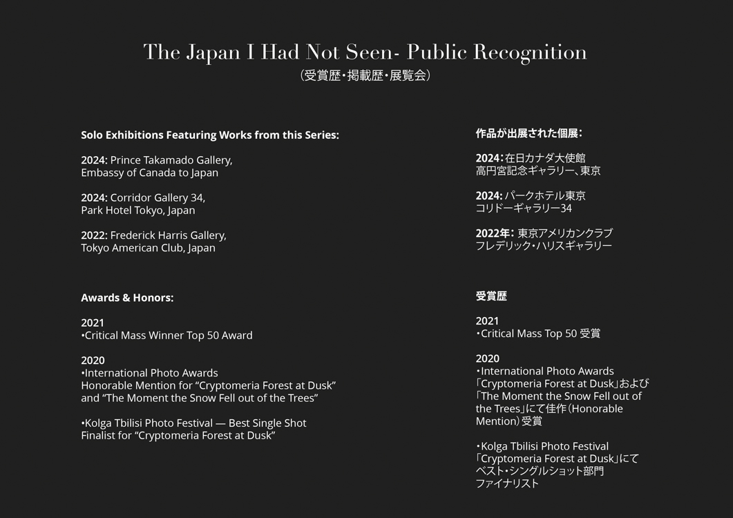 これまで以上に、長き日本の歴史と豊かな文化を理解できることへの感謝を感じつつも、その一方で、海外に住んだ期間と、父親がカナダ人であったことによる隔絶された感覚も抱いていた。子供の頃はよく「純粋な日本人じゃないよね」と言われた僕は、調和を求める社会で多様な背景を持つ者として、完全に溶け込むことはできないと気づいた。しかし、それはネガティブなこととは決めつけず、その孤立感を抱き入れ、これが私の感性の本質的な部分だと受け入れるようになった。日本人にとっては、この写真は典型的な日本の風景にしか見えないかもしれない。そして外国人には理解できない写真かもしれない。二つの文化の間に生まれた者こそ日本の新たな原風景のあり方に気づく可能性があるのだと思う。